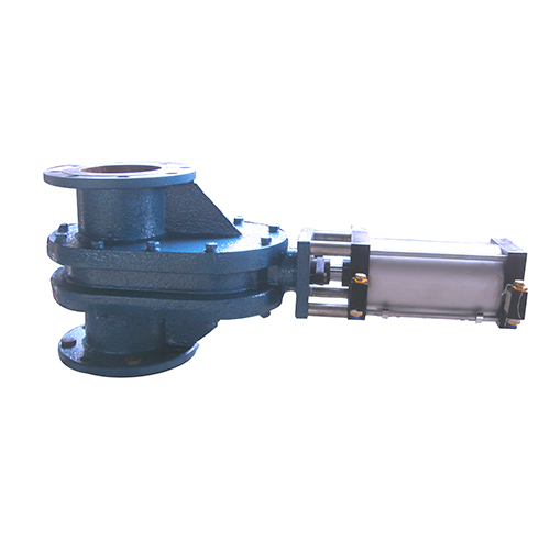 本阀门采用除灰仓泵控制箱对其进行控制,当气源进入执行器A口时,阀杆带动阀板向下运动,阀门关闭。当气源进入执行器B口时,阀杆带动阀板向上运动,阀门开启。阀板与阀座之间加装弹簧,弹簧的弹力始终使阀板压向阀座,保证阀门的密封性和稳定性,又允许阀板在垂直上下方向移动,这有助于补偿阀门零件的热胀冷缩,并能够有效的克服任何背压变化对密封的影响与防止微小的颗粒介质进入两密封面之间的缝隙。在阀门的开启、关闭过程中,双插板的阀板能产生自转,进而使得密封面之间能够产生研磨,也有效的起到了抛光作用,而且由于阀体对通道存在偏心的设计,在阀门开启排卸粉体物料时,这样会产生有效的涡流,形成的物料的旋涡,这样阀板会自行清扫阀门内腔。所有的这些特点,使得这种阀门具有较长的使用寿命,为您的系统安全运行提供了可靠的保证。